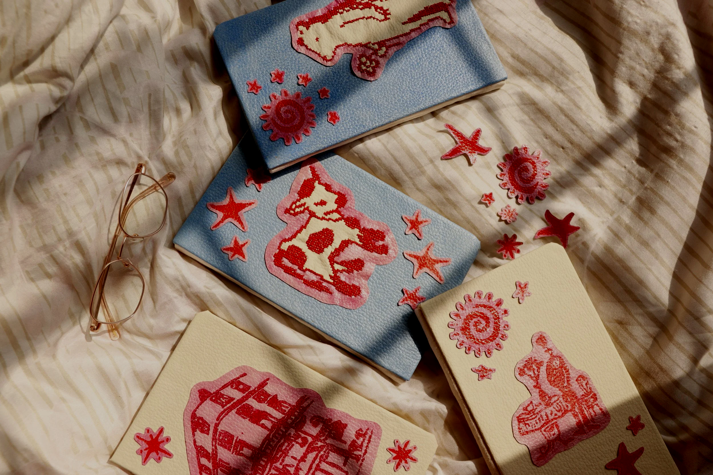 Cuaderno cosido hecho a mano con ilustraciones en 3D bordadas y pintadas a mano.